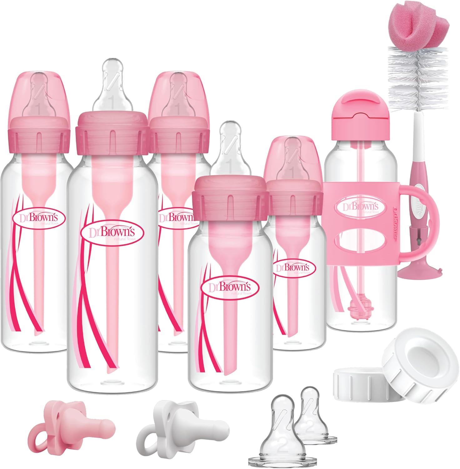Anti-Colic Options+ Narrow Bottle Gift Set with Sippy Straw Bottle, HappyPaci Silicone Pacifiers, Storage/Travel Caps, and Bottle Brush, Pink