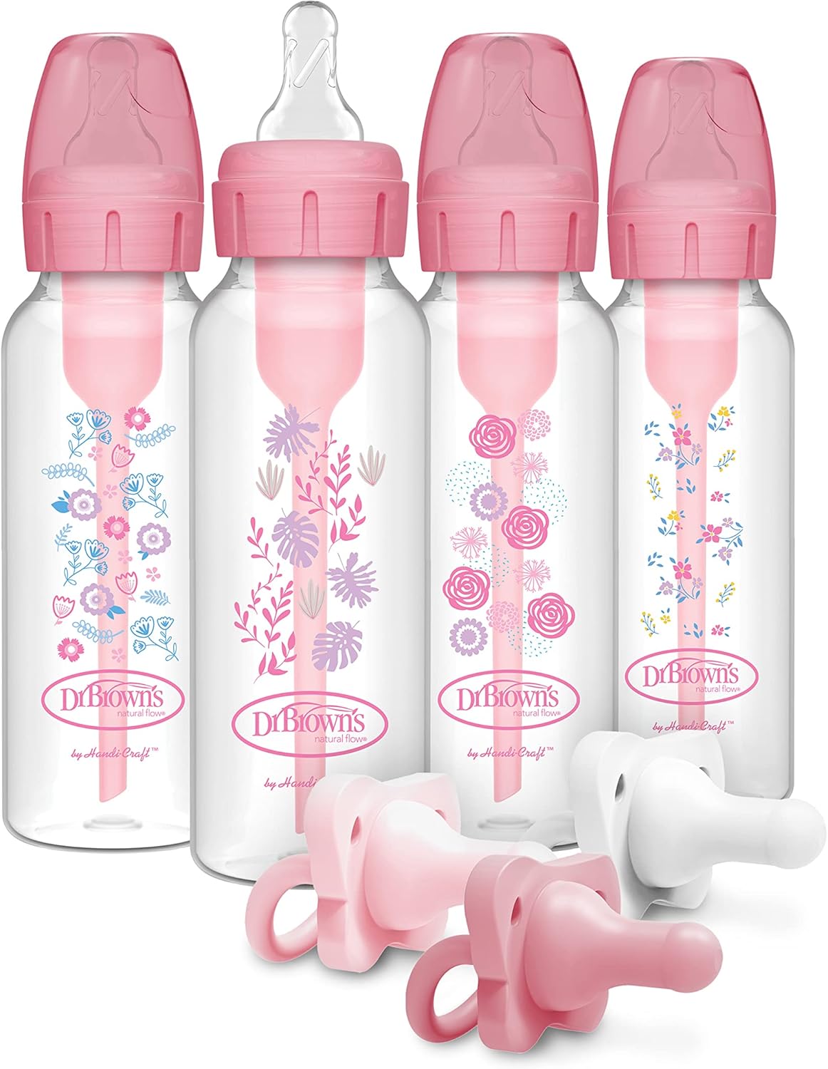 Dr. Brown's Anti-Colic Options+ Narrow Baby Bottle 8 oz Pink Floral + Pacifier