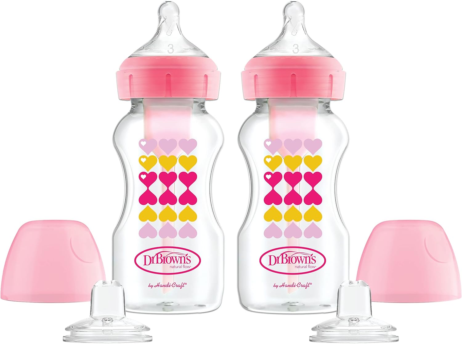 Dr. Brown’s Anti-Colic Options+ Wide-Neck Sippy Bottle Starter Kit, 9oz/270mL, with Level 3 Medium-Fast Flow Nipple and Soft 100% Silicone Sippy Spout, Pink, BPA Free, 6m+, 2 Pack